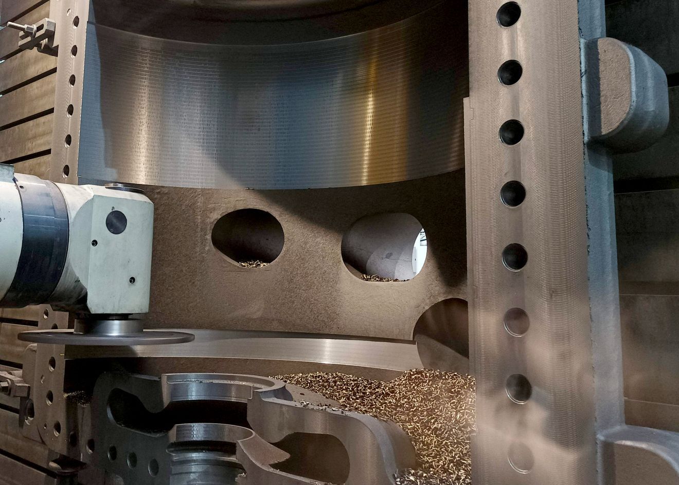 Complete machining of compressor casings for the energy sector. Specifically, this involves combined machining with bi-rotary heads, barrels, and D'Andrea head. With the millesimal bi-rotary head, we have the possibility to reach any inclination while ensuring excellent precision. The D'Andrea head allows external and internal turning up to 2000 mm in diameter.