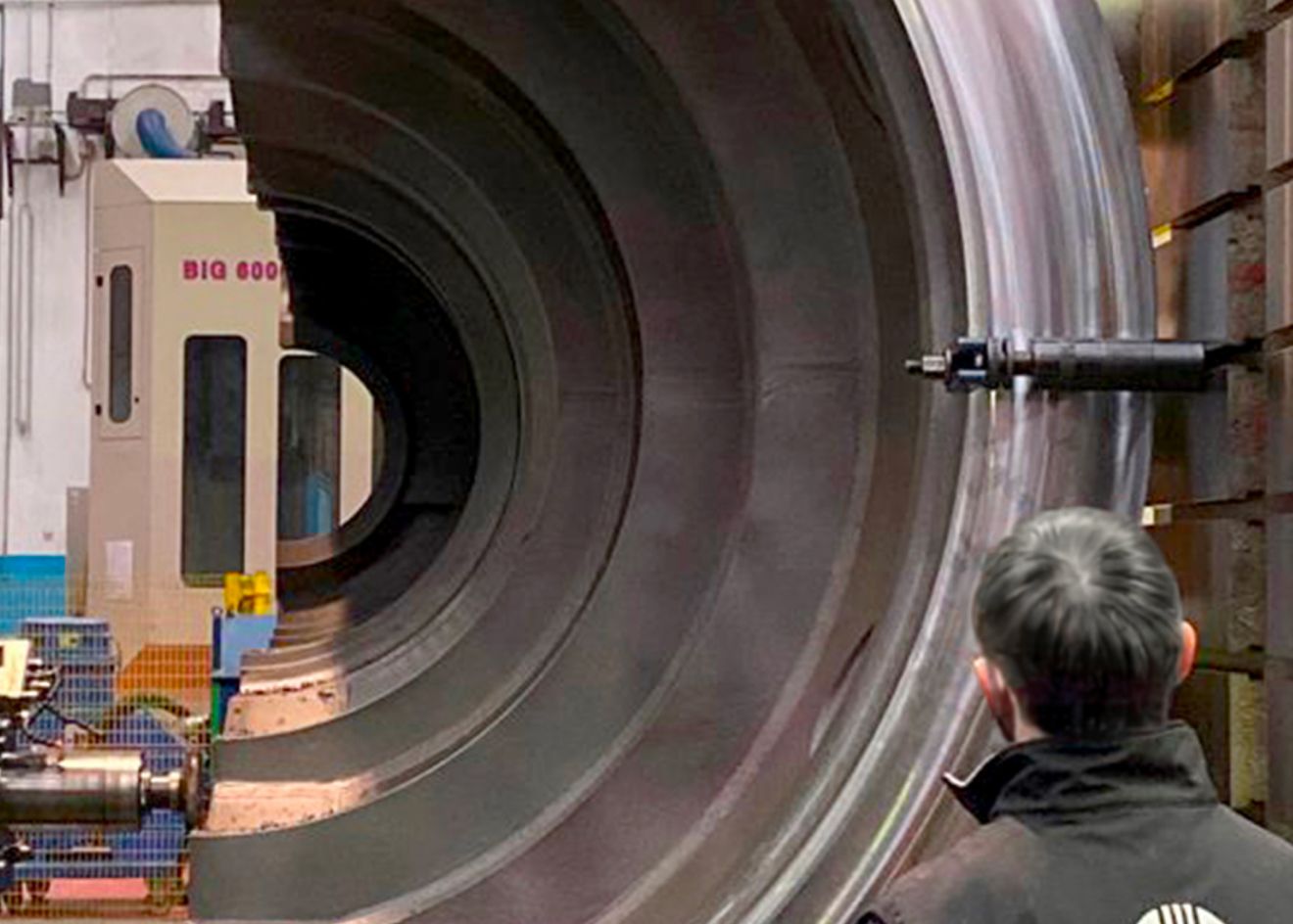 Lavorazione completa di involucro compressore per settore Energia. Si tratta nello specifico di lavorazioni combinate con teste birotative ,canotti e testa D'Andrea. Tramite la testa birotativa millesimale abbiamo la possibilità di raggiungere qualunque inclinazione assicurando nel contempo un'ottima precisione. La testa D'Andrea permette torniture esterne ed interne fino a diametri di 2000mm.
