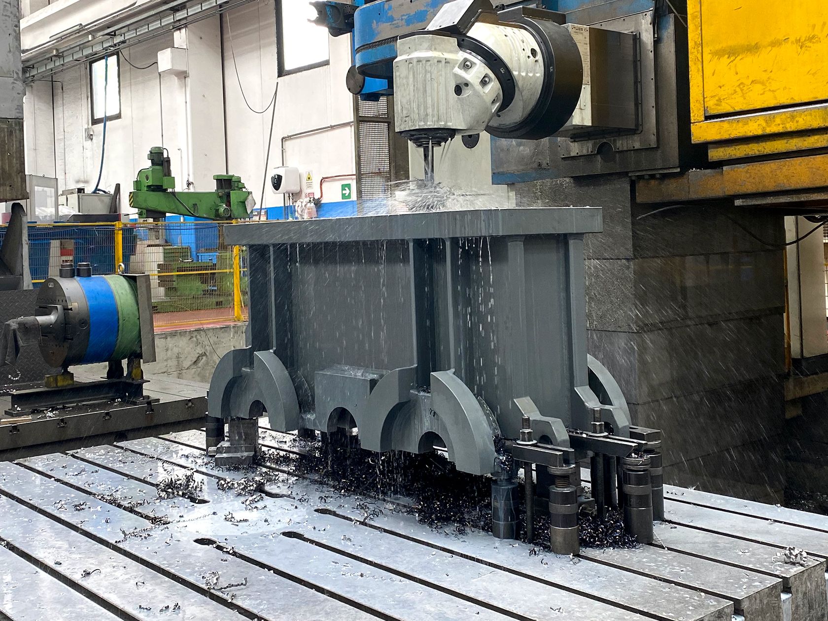 Lavorazioni di fresatura, foratura ed alesatura a disegno su cassa riduttore del peso di circa 2.500,00 Kg. (1500mm X 1300mm) per importante cliente tedesco. Materiale acciaio per impiego strutturale.